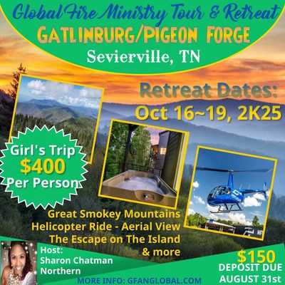 Global Fire Apostolic Network is excited and delighted to organize and announce our Fall 2K25 Destination Tour and Retreat. This is certain to be an unparalleled 3 Night/4 Day "GIRL'S TRIP" Destination Tour and Retreat for women - ages 19 & beyond. Tour & Retreat Cost covers Accommodations, Transportation, Morning and Evening Meals.